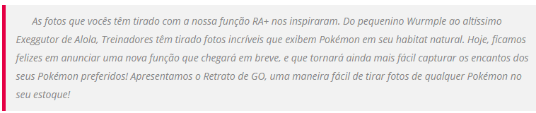 Aparentemente, a Niantic ainda prepara diversas novas funcionalidades para serem inauguradas em Pokémon GO no ano de 2019. A primeira delas, revelada no dia de hoje, se chamará Retrato de GO, e abrirá novas possibilidades para se tirar fotos com as criaturas. Aparentemente, a função servirá para que os treinadores consigam capturar imagens no jogo, tornando mais fácil o uso da realidade aumentada.